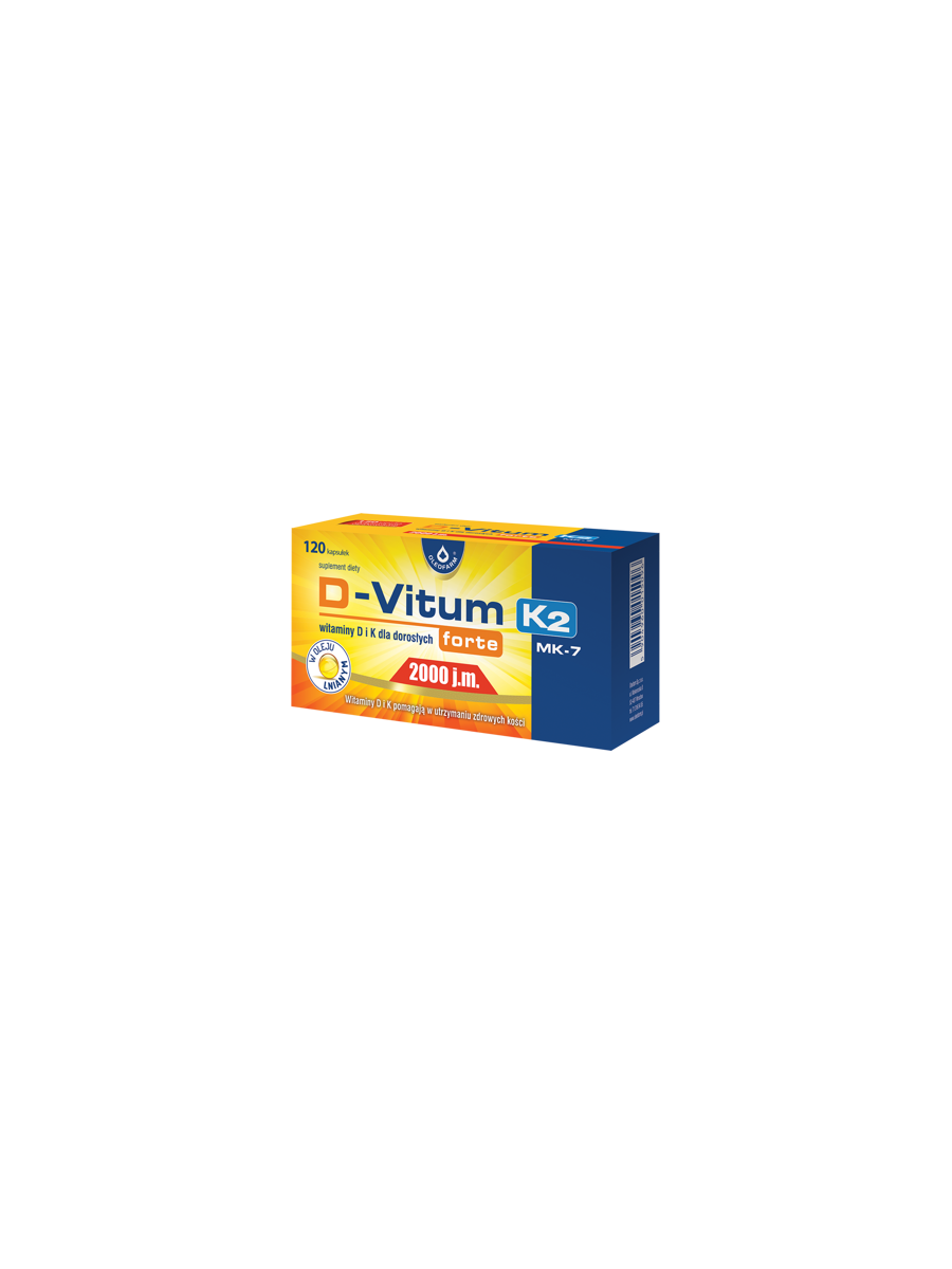 D-Vitum forte 2000 j.m. K2 to wysokiej jakości suplement diety zawierający olej lniany o wysokiej zawartości kwasów tłuszczowych omega-3, w którym występuje kwas alfa linolenowy (ALA). Wspomaga proces podtrzymania prawidłowego cholesterolu we krwi. Pozytywne działanie substancji występuje przy spożyciu 2 g ALA dziennie.