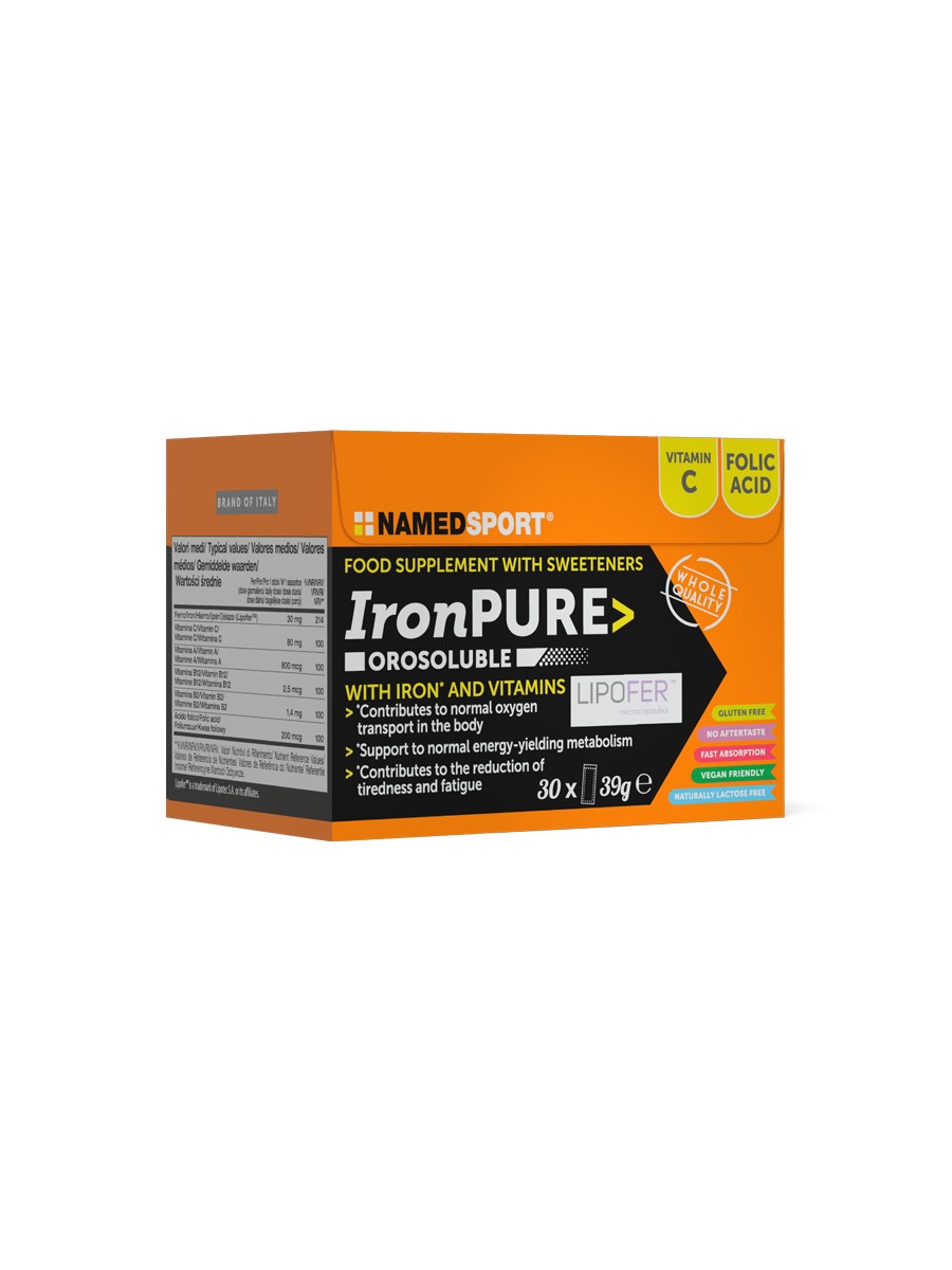 IronPure> to innowacyjne połączenie suplementu żelaza z witaminami i kwasem foliowym, które wspomaga zdolności wysiłkowe, prawidłowe funkcjonowanie organizmu i dobre samopoczucie. IronPure> dostarcza doskonale przyswajalne żelazo liposomalne Lipofer™ oraz witaminy C, A, B2, B12 oraz kwas foliowy, zamknięte w mikrokapsułkach. Taka postać żelaza liposomalnego znacząco minimalizuje ryzyko wystąpienia dolegliwości żołądkowo-jelitowych czy niekorzystnych reakcji z innymi składnikami odżywczymi, a także zapewnia stopniowe uwalnianie jonów żelaza.