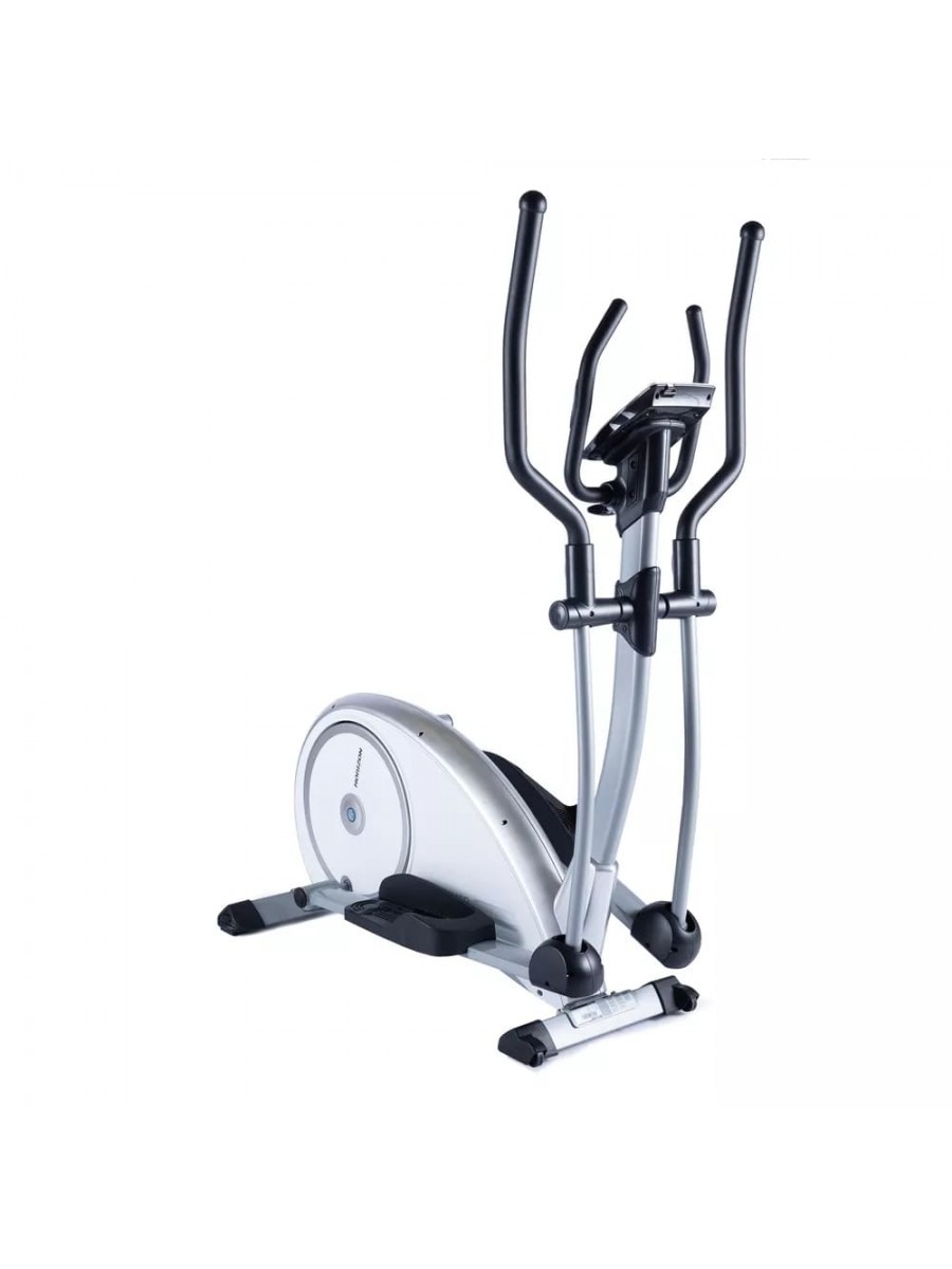Crosstrainer wyposażony w podesty stóp regulowane w 3 kierunkach, elektroniczny magnetyczny układ hamulcowy, 16 elektronicznie regulowanych rezystorów z regulacją watową i wyświetlacz LCD 6,25" z niebieskim podświetleniem.