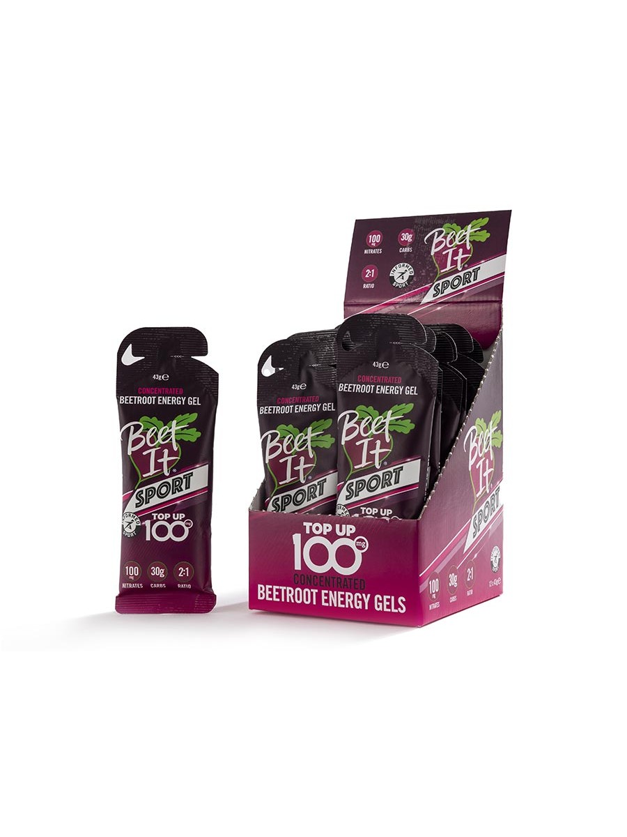 Energy Gel Top Up 100 to skoncentrowany żel energetyczny z buraka, który zawiera 100 mg azotanów, 150 mg sodu oraz 30 g łatwo przyswajalnych węglowodanów (w proporcji 2:1 glukoza do fruktozy). Pomaga utrzymać wydolność podczas długotrwałego wysiłku. Produkt zapewnia czystszą i bardziej efektywną formułę energetyczną.