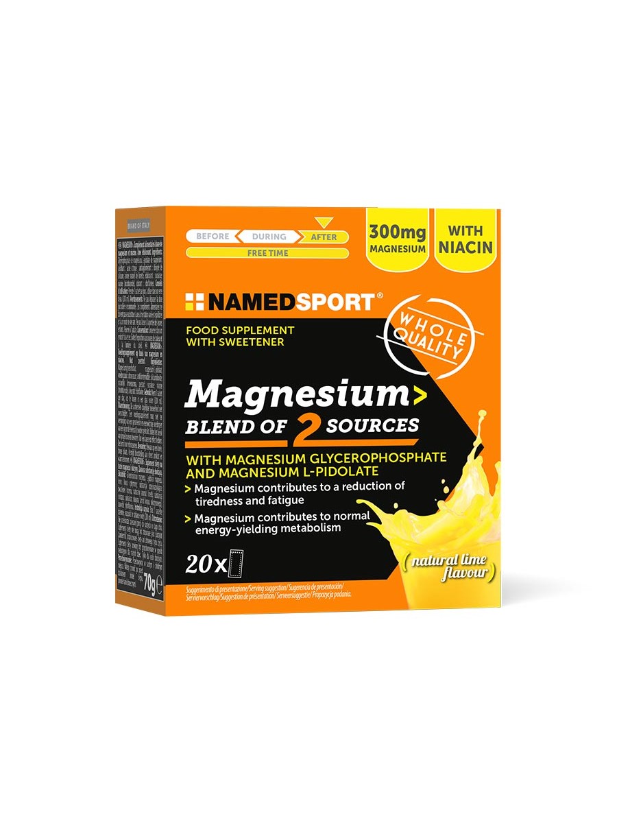 Suplement diety Magnesium 2 Blend Of 2 Sources od NAMEDSPORT to połączenie glicerofosforanu magnezu, pidolanu magnezu oraz witaminy B3, tworzące łatwo przyswajalną formułę w postaci proszku do rozpuszczania w wodzie. Każda porcja znajduje się w praktycznej saszetce, co umożliwia dokładne dawkowanie i szybkie przygotowanie napoju.