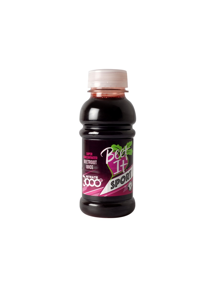 Beet It Sport 3000 Nitrate to buraczany super koncentrat z soku z buraka, który zawiera w sobie 3000 mg naturalnych azotanów. Buteleczka podzielona jest na 7 dawek po 35 ml. Takie rozwiązanie zapewnia maksymalną ilość azotanów w minimalnej objętości, gdyż w 35 ml skoncentrowanego soku z buraka znajduje się ponad 400 mg azotanów. Sok jest w 100% naturalnym produktem.